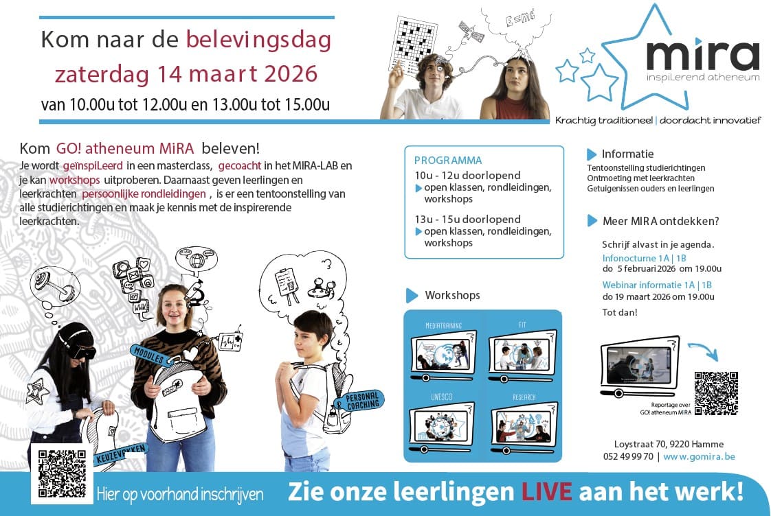 Je wordt geïnspiLeerd in een masterclass, gecoacht in het MIRA-LAB en je kan moduleworkshops uitproberen.